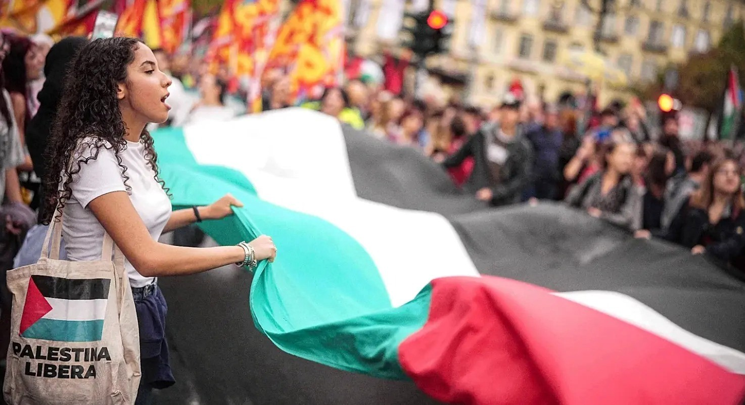 وبلغت هذه الجهود ذروتها في لحظة لا تصدق في أكتوبر، إذ اجتاحت المظاهرات والإضرابات الجماهيرية أكثر من 100 مدينة، وشارك فيها ما يقدر بنحو مليوني شخص. وقد أوفت النقابات اليسارية والحركة الفلسطينية بوعدها بـ ”عرقلة كل شيء“ من أجل غزة. شلّ المجتمع، من الموانئ إلى السكك الحديدية إلى المصانع. تم حصار المدارس واحتلال الجامعات. وفشلت محاولات رئيسة الوزراء الفاشية الإيطالية جيورجيا ميلوني لتشويه صورة الحركة وتقليل أهميتها وقمعها. تم تمزيق ”مرسوم أمني“ استبدادي أصدرته حكومتها في وقت سابق من هذا العام لتجريم الاحتجاجات المزعزعة للأمن، حيث قام مئات الآلاف بحصار التقاطعات الرئيسية والطرق السريعة.